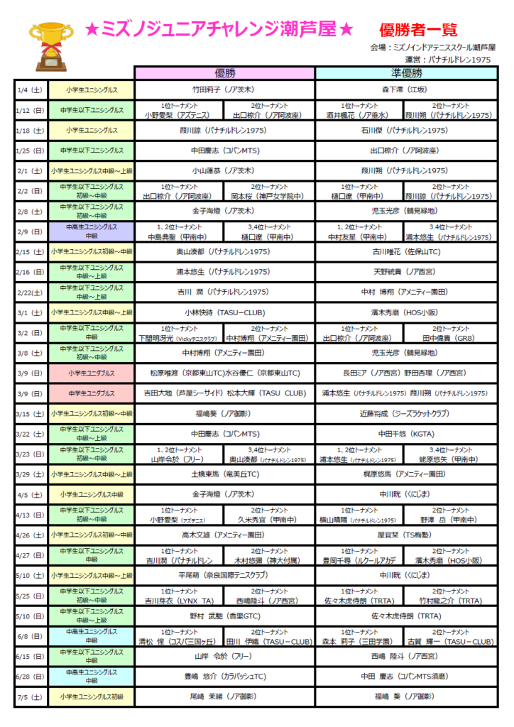 ミズノインドアテニススクール潮芦屋にて2025年10月5日までに開催された大会結果をお知らせします!